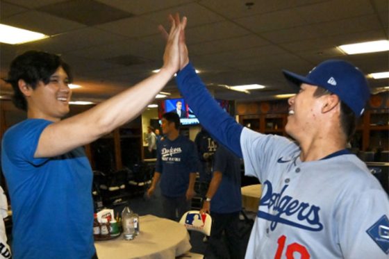 完投の山本由伸に…大谷翔平が示した“敬意” 満面の笑みでとった行動、捉えられた1枚